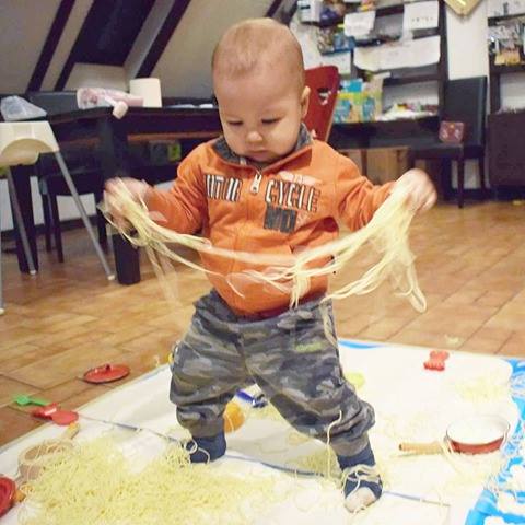 Preparate una tavola (non sul pavimento come ho fatto io, vi assicuro che vi trovereste spaghetti su tutta la superficie di casa), imbandita di pentole, cucchiai, pinze, mestoli, piatti e contenitori di ogni genere e forma. Cuocete un bel po’ di spaghetti, mettete qualche goccia d’olio per far si che rimangano separati, fateli raffreddare e consegnateli ai vostri bimbi.