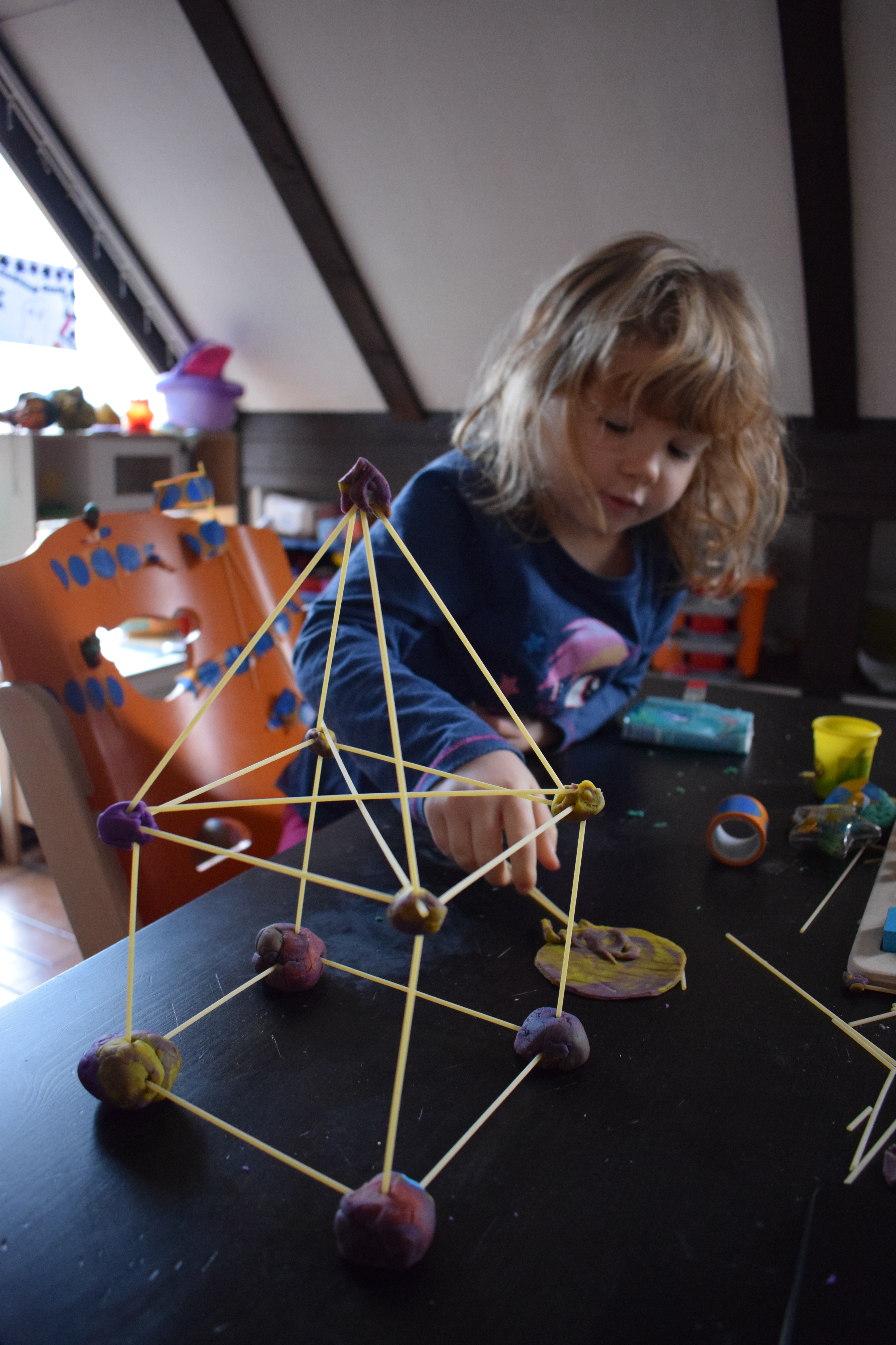 Provate a tirare su una casa con pongo e spaghetti! Quest’attività con la mia bimba di 5 anni è stata un successo soprattutto perché inizialmente avevo sbagliato la quantità di pongo alle basi, troppo poca, quindi mia figlia è intervenuta dandomi delle buone soluzioni, come rinforzare la struttura alla base aggiungendo altri spaghetti in verticale e mettendone altri in diagonale per migliorare l’equilibrio della struttura.