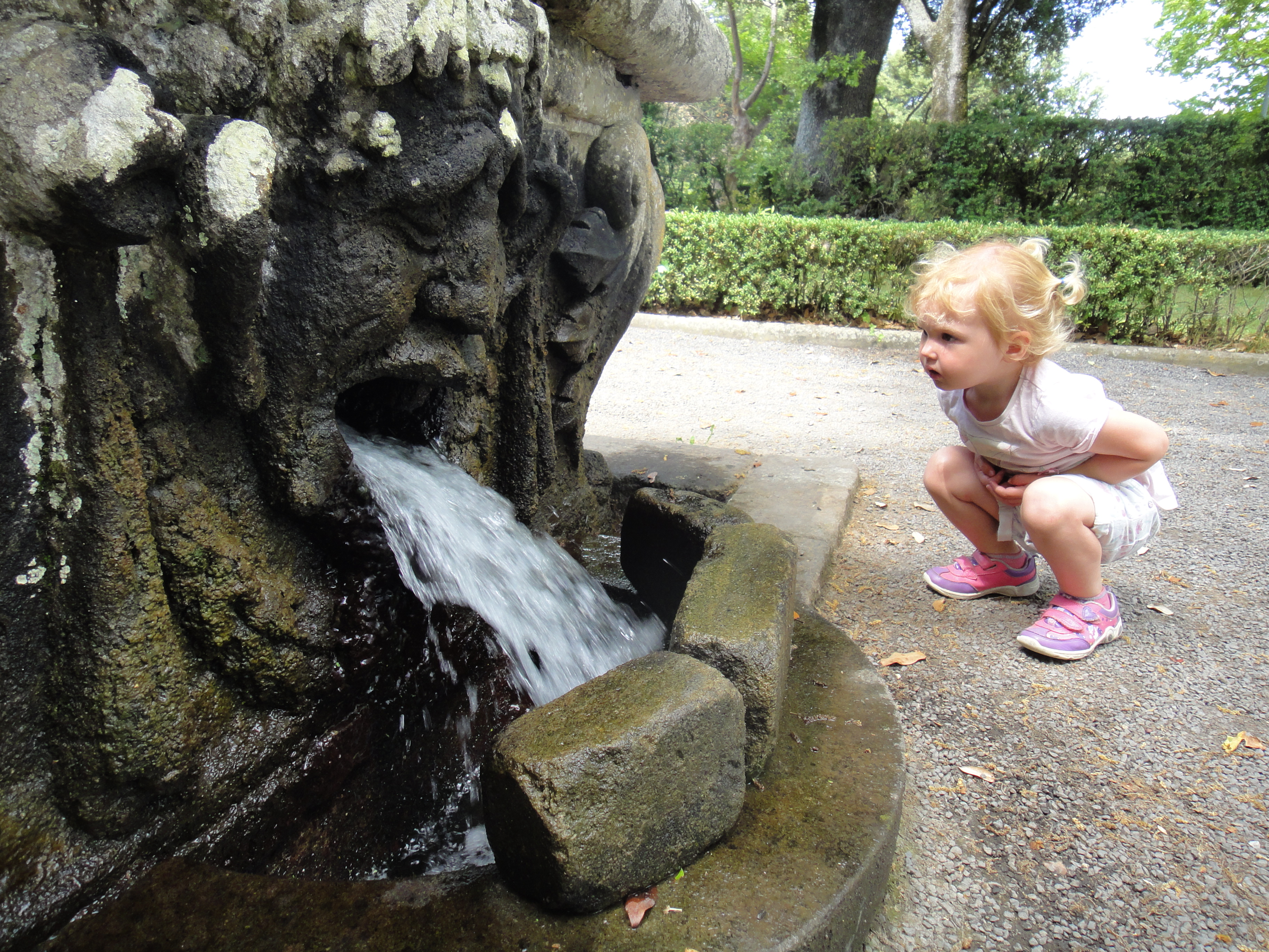 Salendo ancora si arriva alla “mensa del Cardinale“, una specie di tavolo in pietra, che veniva usato per banchetti all’aperto,  attraversato al centro da un piccolo corso d’acqua che esce in basso da una bellissima maschera. Questo bel faccione ha praticamente ipnotizzato per almeno  20 minuti le mie piccole che ne hanno poi approfittato per bagnarsi un po’.