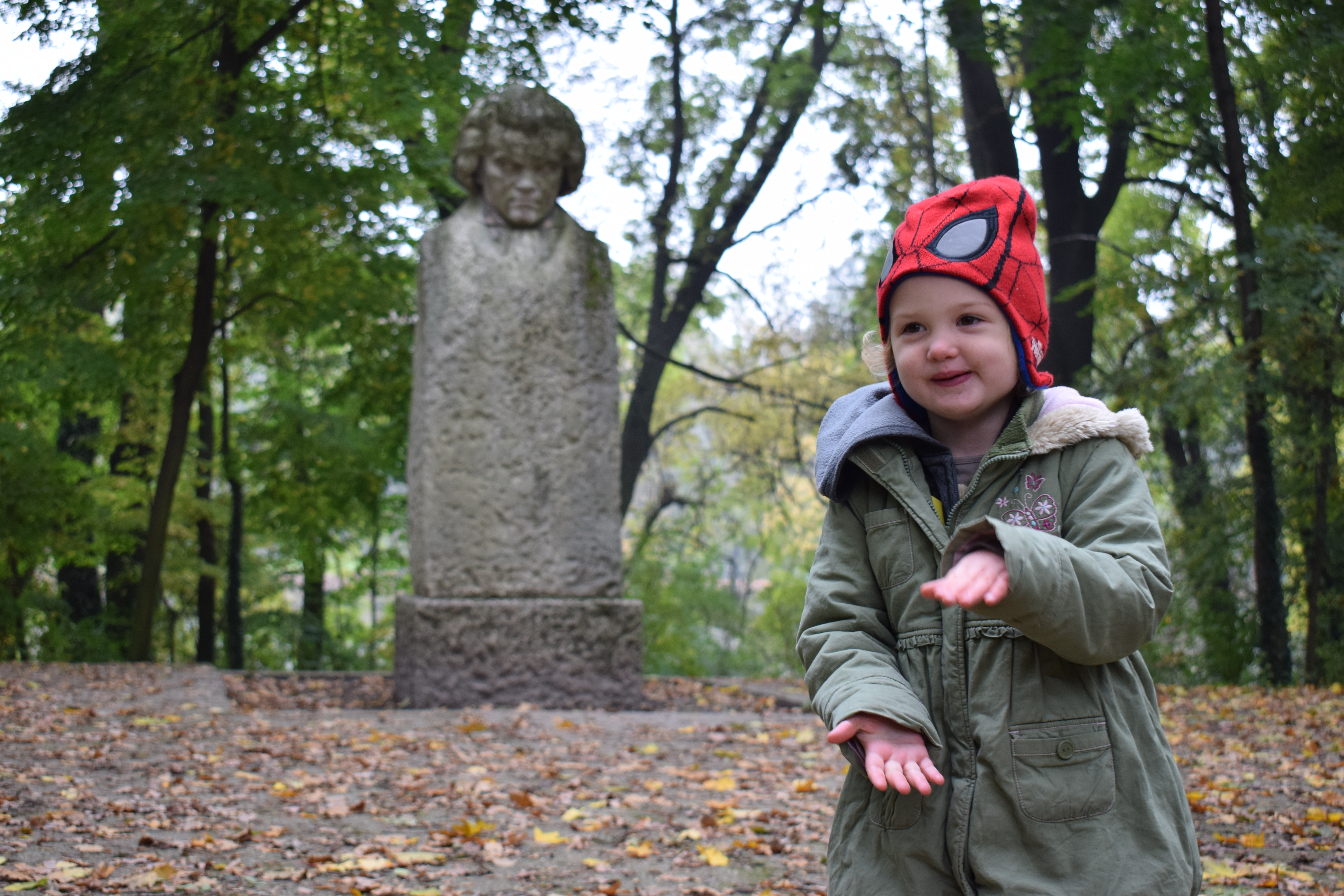 Lo scopo della nostra passeggiata era quello di arrivare, nonostante il freddo, al ponte che conduce all’interno dell’isoletta. Una piccola avventura terminata con uno show dei miei bambini sul podio di cemento dove si trova una statua di Beethoven (in Estate viene utilizzato per dei concerti).