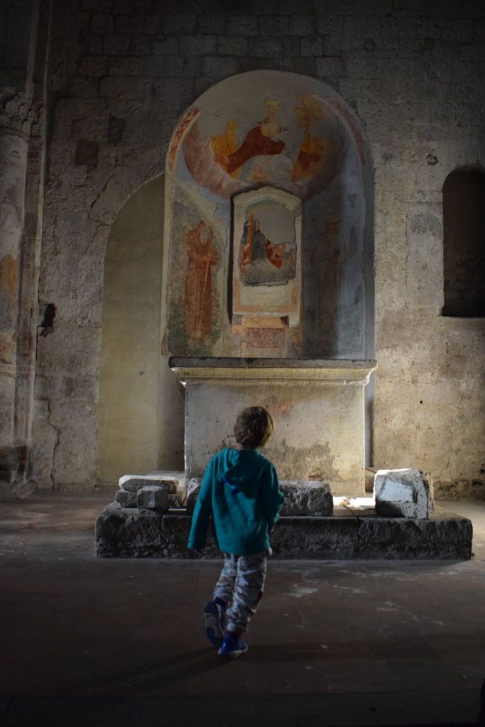 Dopo aver riempito la pancia dei nostri piccoli siamo andati a piedi verso la chiesa di San Pietro e l’abbiamo trovata chiusa, dalle foto che avevo visto online pensavo che fosse possibile almeno vederne la facciata ma non era così. Ho poi scoperto che per visitarla è necessario chiamare il numero di cellulare 347.8838069.