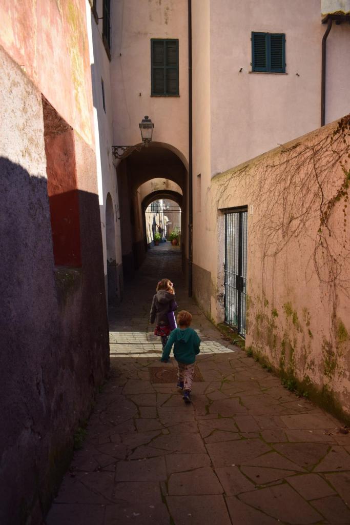 Dopo abbiamo intrapreso una salita che costeggia le mura e ci siamo trovati in una piazza con una trattoria (da Alfreda) gremita di persone. Proprio lì davanti si trova l’entrata del Parco Tor di Lavello. Un parco con vista mozzafiato che ha anche un orologio solare dove i bambini possono divertirsi a capire che ore sono. Noi ci siamo fermati lì per un po’ di tempo a disegnare il bellissimo panorama, a ricalcare sopra un foglio il simbolo della corona sull’orologio solare e a correre dentro un piccolo anfiteatro moderno.